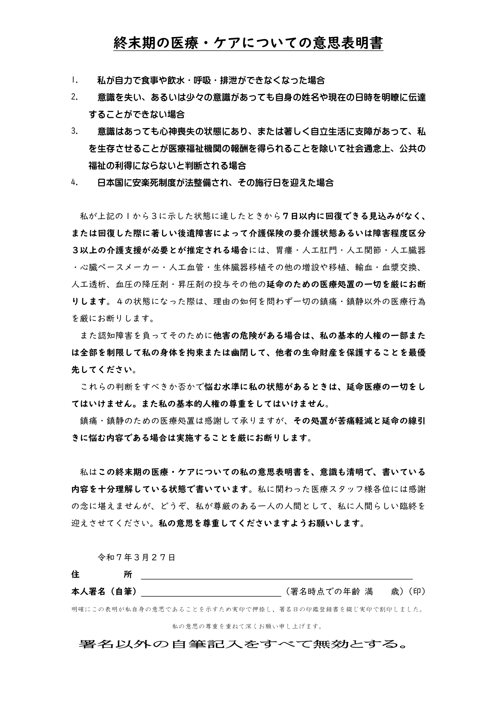 ぼくは延命措置なんてクソ食らえという思考の人なので、それを明文化して携行しているのですが、前回に作成したリビングウィルが令和元年のものでかなり古く、その状態だとぼくが瀕死の状態で関わった医者が「書いた日があまりにも昔なのでこれが現時点での本人の意思とは言えない」などと反論して延命フルコースのスパゲティ症候群にされて数年から下手すれば数十年そのままベッドに転がされるなんて悪夢がありえるなあと思いまして、これを書き直しました。